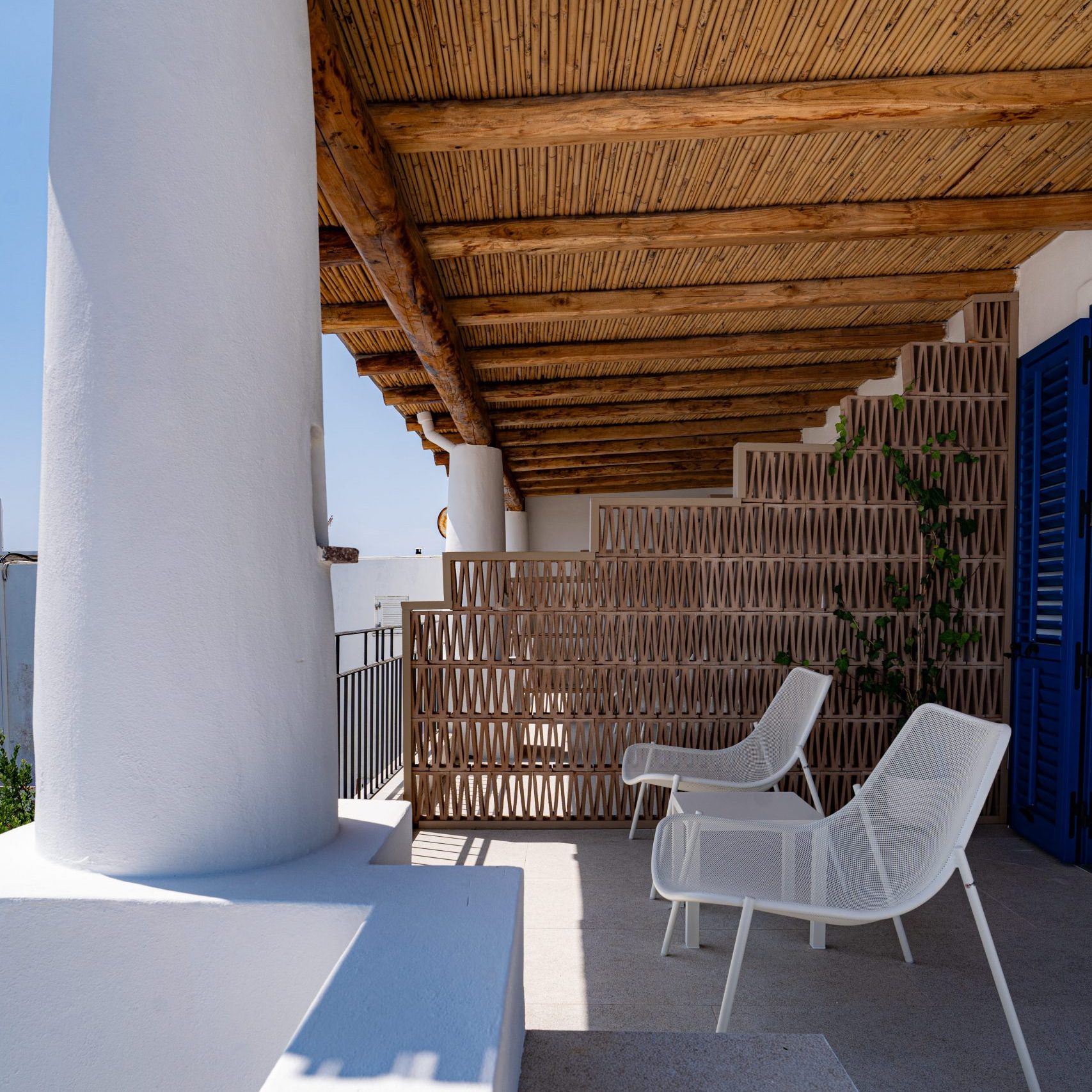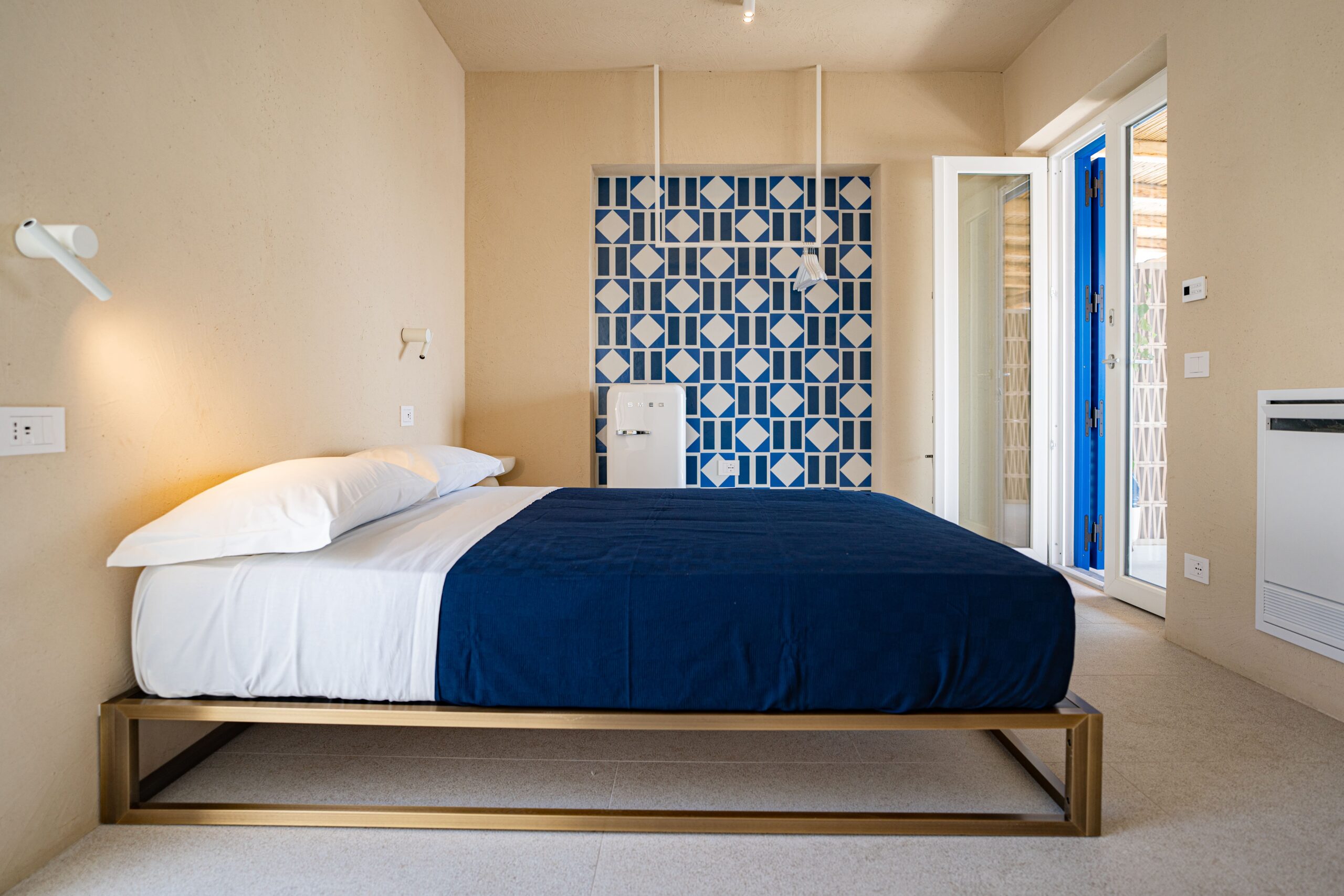 pavimenti in cementine originali dal Marocco, pareti in calce grezza, pietra bocciardata e arredi su misura in metallo e paglia si intrecciano in un dialogo continuo tra memoria e innovazione.